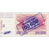 The diagonally overprinted 100,000 dinara note is an official issue, but larger denominations with horizontal overprints are considered contemporary counterfeits