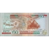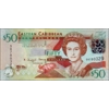 Description: Colour: Blue, green, red, and yellow. - Front: English text; fish; Central Bank headquarters building; sea turtle; Queen Elizabeth II wearing Grand Duchess Vladimir’s tiara and Queen Victoria’s golden jubilee necklace; green-throated carib bird and flowers; rectangular foil flower patch. - Back: English text; Brimstone Hill fortress in St. Kitts; map of islands; silver compass rose; Les Pitons (volcanoes) in St. Lucia; sooty tern bird; fish. - Solid security thread and 2.0-mm wide Facet windowed security thread with demetalized ECCB 50. - Watermark: Queen Elizabeth II, electrotype ECCB, and Cornerstones - Printer: DE LA RUE. - Size: 145 x 70 mm.