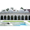 Front: Stylized flowers; Tara Masjid (The Star Mosque) in Dhaka.