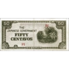 B804a - P105a - 50 centavos - ND (1942) - Grade: XF+ - No signature - Description: Colour: Black, blue, and violet. Front: English and Japanese text; coat of arms; two natives riding water buffalo amid banana trees. Back: Guilloche patterns. No security thread. Watermark: Quatrefoil pattern. Printer: 府政國帝本日大 (Greater Japan Imperial Government). Size: 120 x 58 mm. - Material: Paper - 2-letter series PI