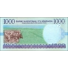 Description: Colour: Green, blue, and brown. - Front: French text; Volcanoes National Park. Back: Kinyarwanda text; Ankole-Watusi cattle; workers in tea plantation feld. - Solid security thread with demetalized BNR. - Watermark: Intore dancers head and electrotype BNR. - Printer: Unknown. - Size: 145 x 73 mm. - Material: Paper.