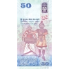 Description: Colour: Blue and green. Front: English, Sinhala, and Tamil text; Blue Oakleaf (Kallima philarchus) butterfly; ancient stone arch railway bridge with train; old steel bridge; new concrete automobile bridge at Manampitiya; Sri Lanka dull blue flycatcher (Eumyias sordida) bird; Lion holding whip with sword. - Back (vertical): English, Sinhala, and Tamil text; Yakbera drummer and Vadiga Patuna dancer; guard stone (muragala) with punkalasa (pot of plenty, symbol of prosperity); stylized liya vela floral motif. - Solid security thread with printed CBSL RS 50. - Watermark: Flycatcher bird with electrotype 50 and Cornerstones. - Printer: DE LA RUE. - Size: 133 x 67 mm. - Material: Paper