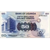 Front: English and Swahili text; Bank of Uganda building in Kampala; coat of arms.