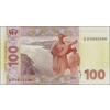 Description: Colour: Olive green, burgundy, and yellow. - Front: Ukrainian text; coat of arms; painter’s palette and brushes; artist Taras Shevchenko. - Back: Ukrainian text; bank logo; Chernecha mountain landscape near Chercasy; kobzar (Ukrainian bard playing the kobza) and guide boy. - Solid security thread with demetalized 100 ГРН and trident. - Watermark: Taras Shevchenko and electrotype 100. - Printer: Printer: (National Bank of Ukraine). - Size: 142 x 75 mm. - Material: Paper
